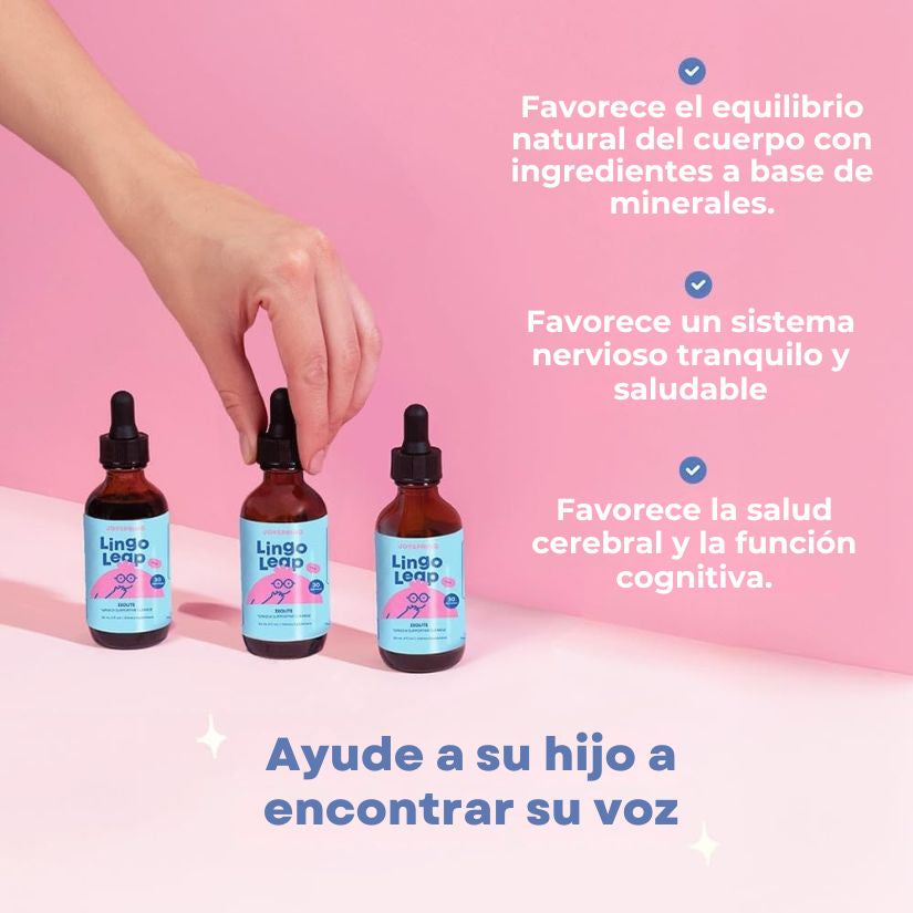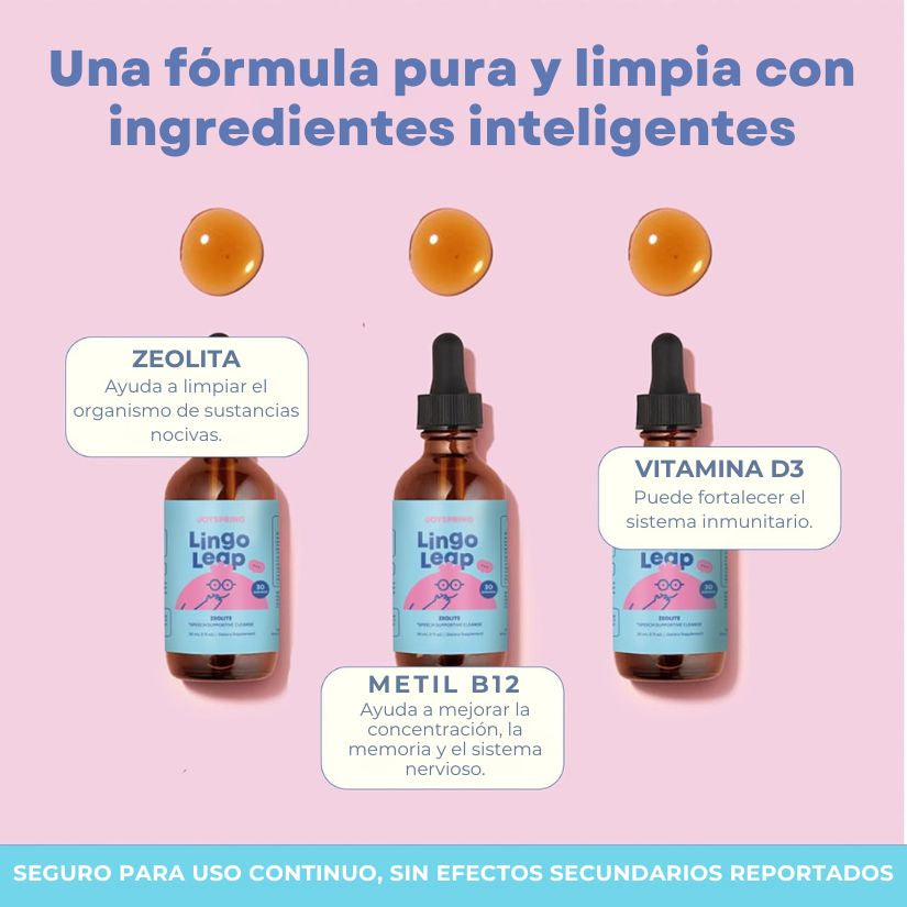 JoySpring LingoLeap combina zeolita activada, Vitamina B12 metilada y Vitamina D3 para apoyar el desarrollo del lenguaje, la comunicación verbal y el bienestar neurocognitivo.