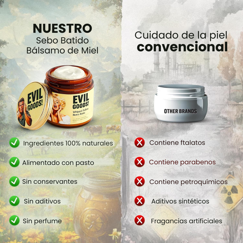 Descubre el poder del sebo de res alimentado con pasto y la miel pura, ingredientes bioafines que la piel reconoce y absorbe naturalmente.