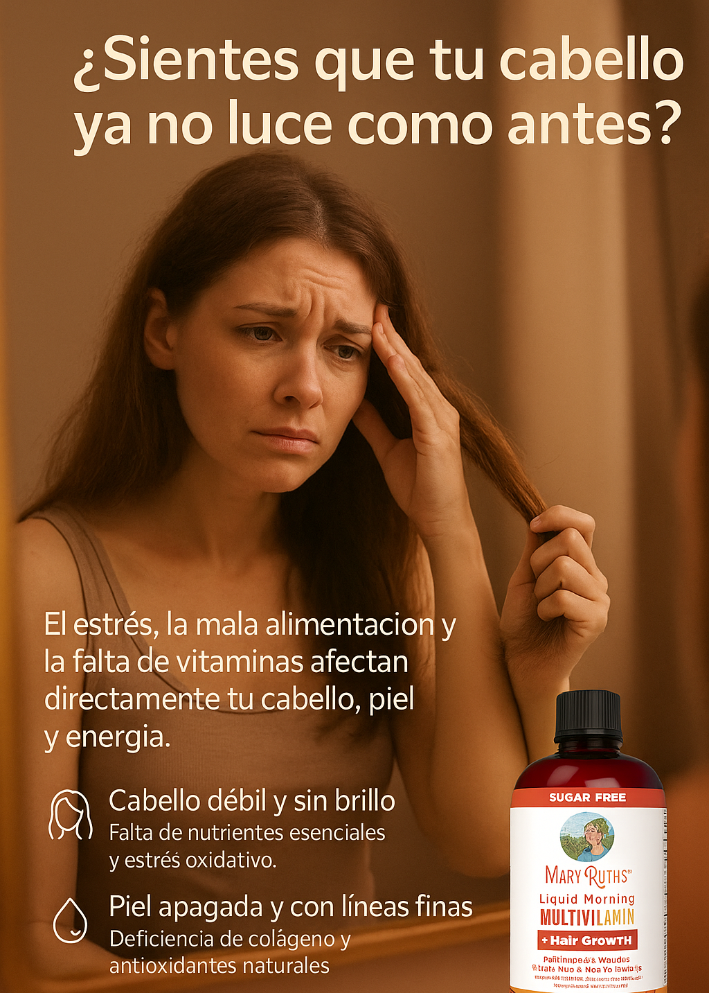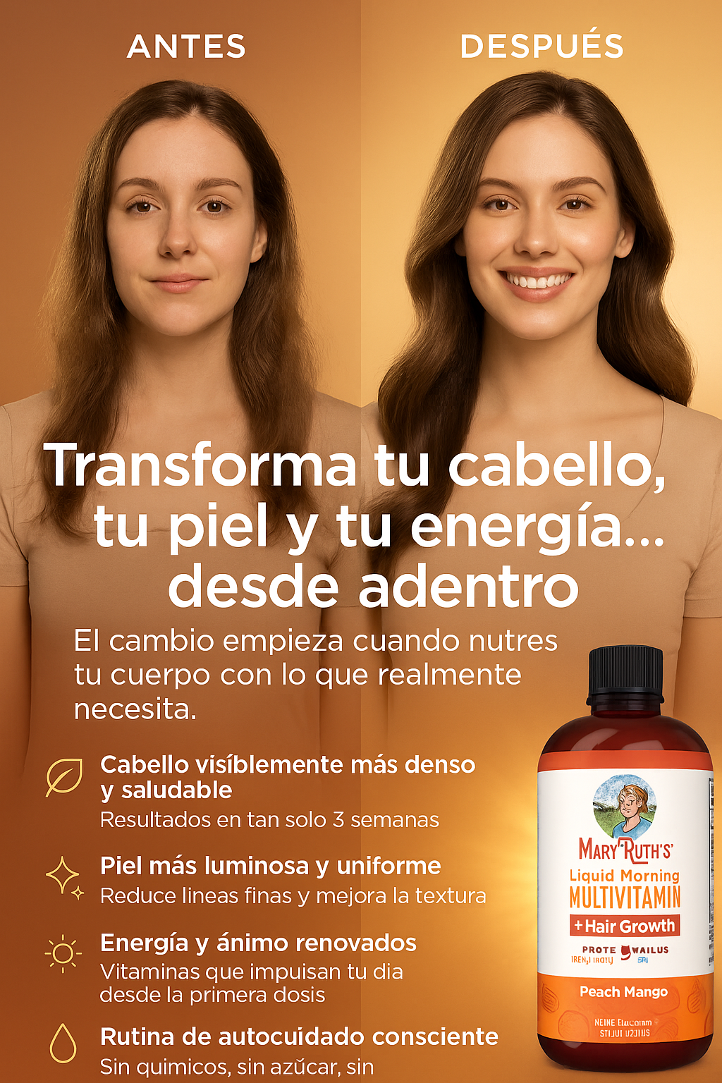 Este multivitamínico líquido no solo nutre, sino que impulsa tu bienestar completo. Con biotina, complejo B y antioxidantes, fortalece tu cabello, ilumina tu piel y te llena de vitalidad desde la raíz.