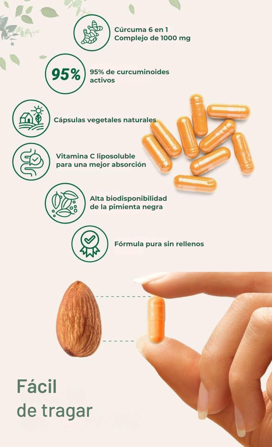 Combina cúrcuma con 95 % curcuminoides activos, pimienta negra, jengibre y vitamina C para aliviar la inflamación y el dolor articular de forma segura y efectiva. Olvídate de los efectos secundarios del ibuprofeno.